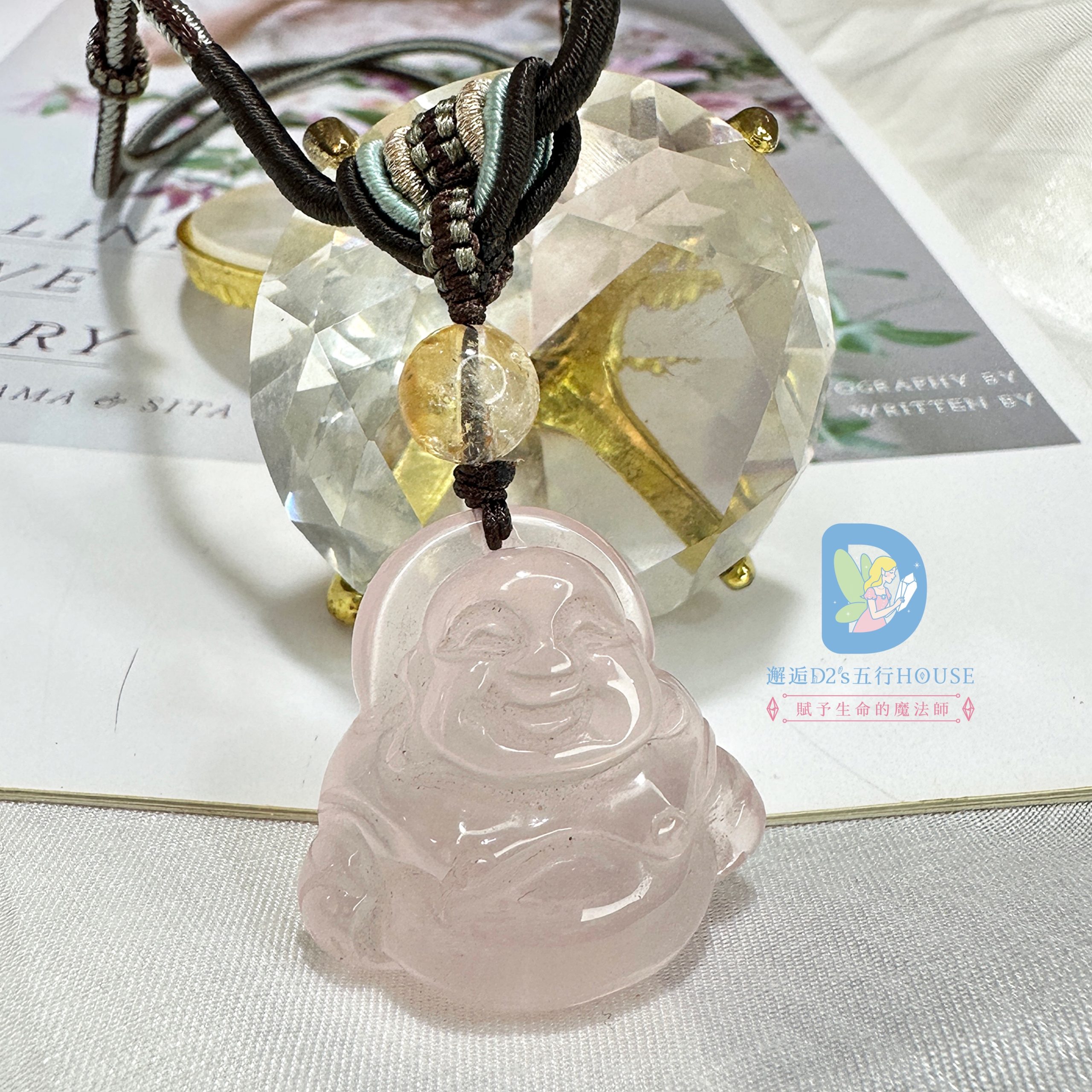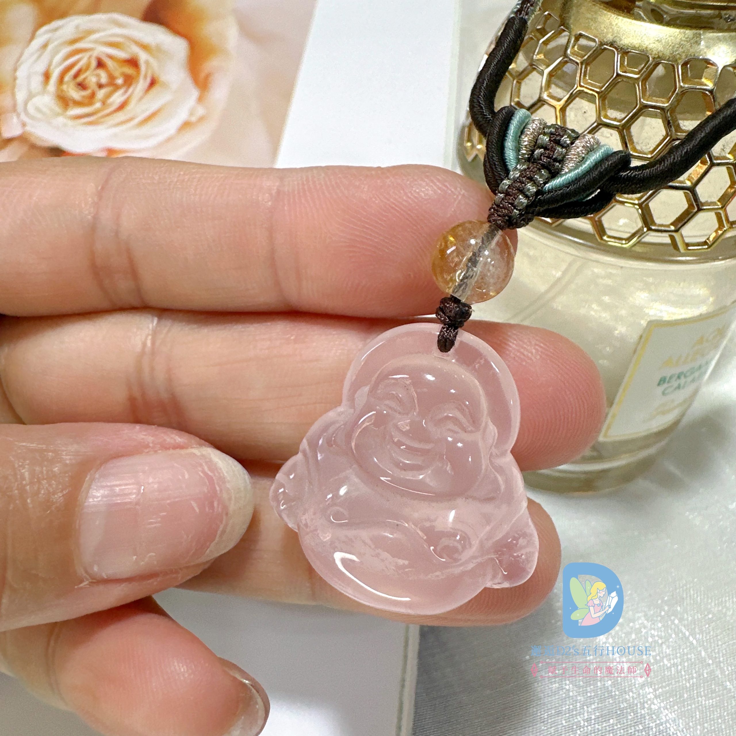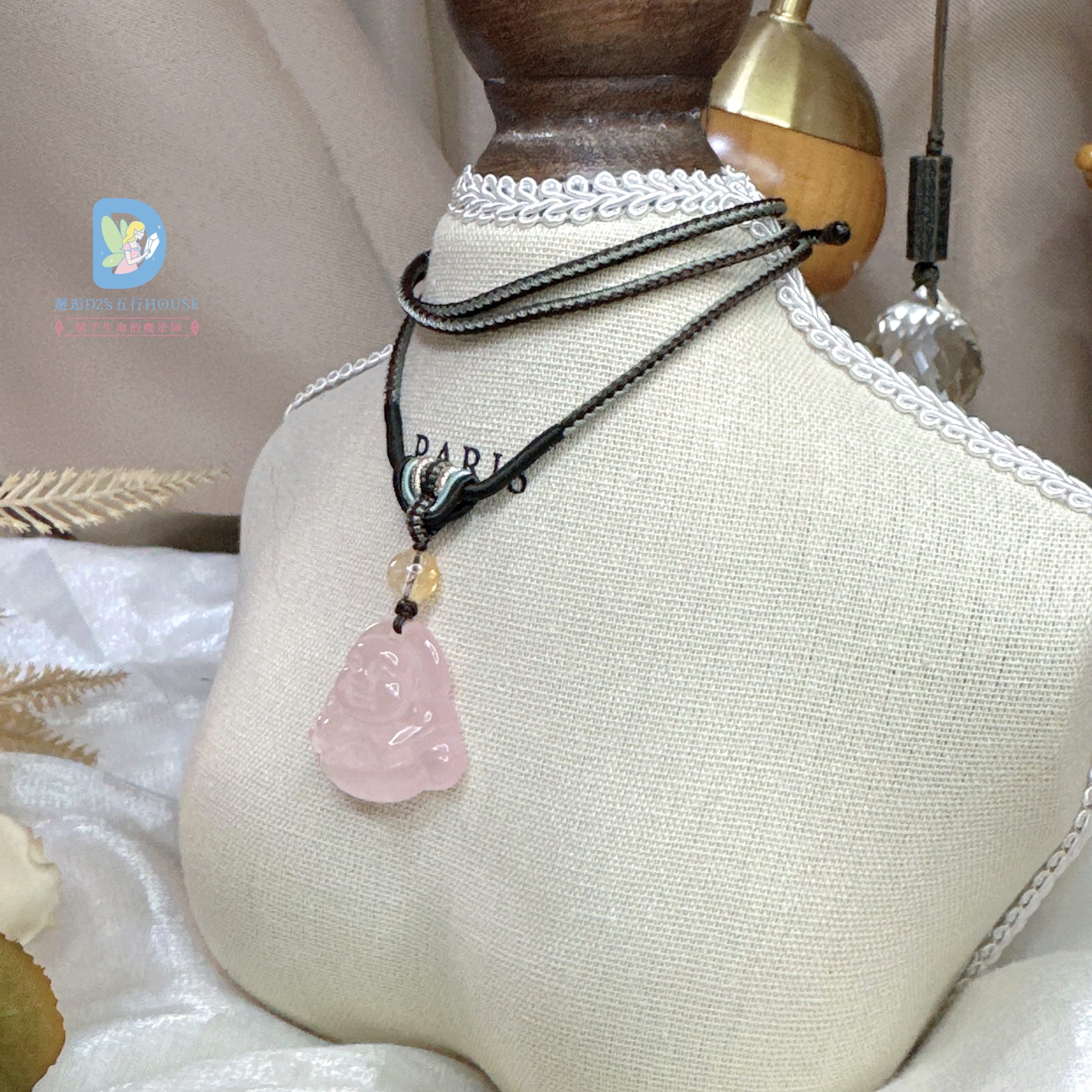 結合粉晶的柔和氣息與彌勒造型的開朗寓意,