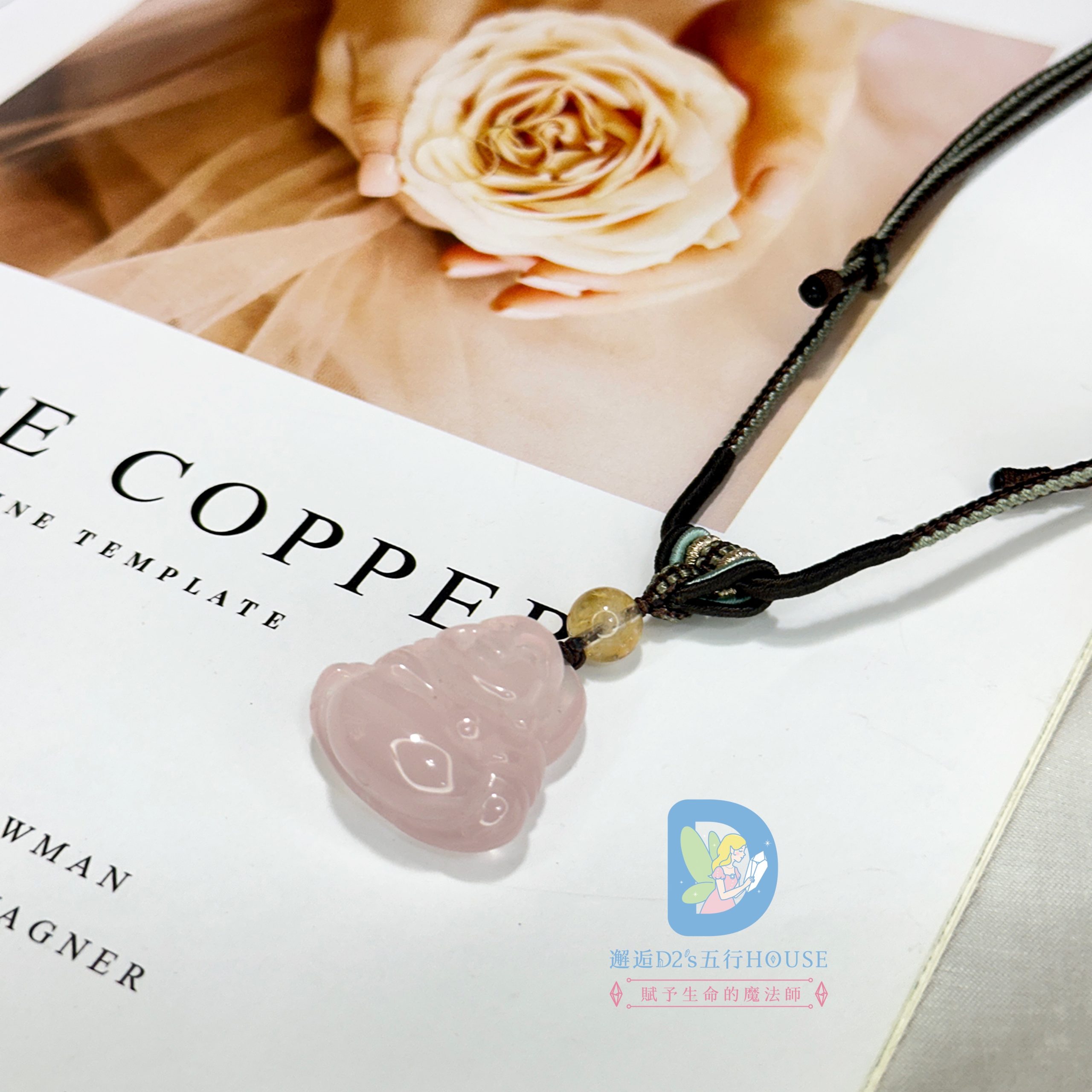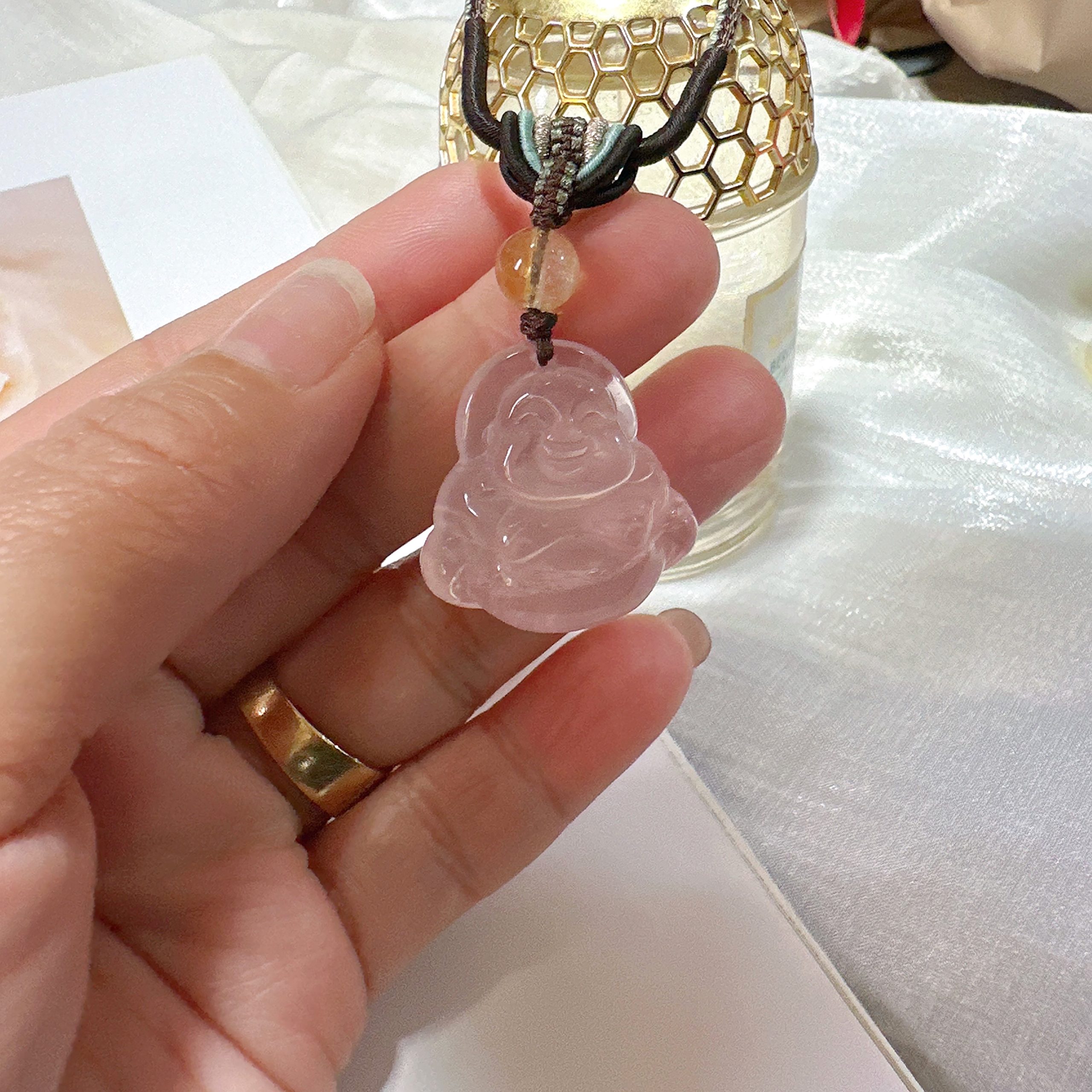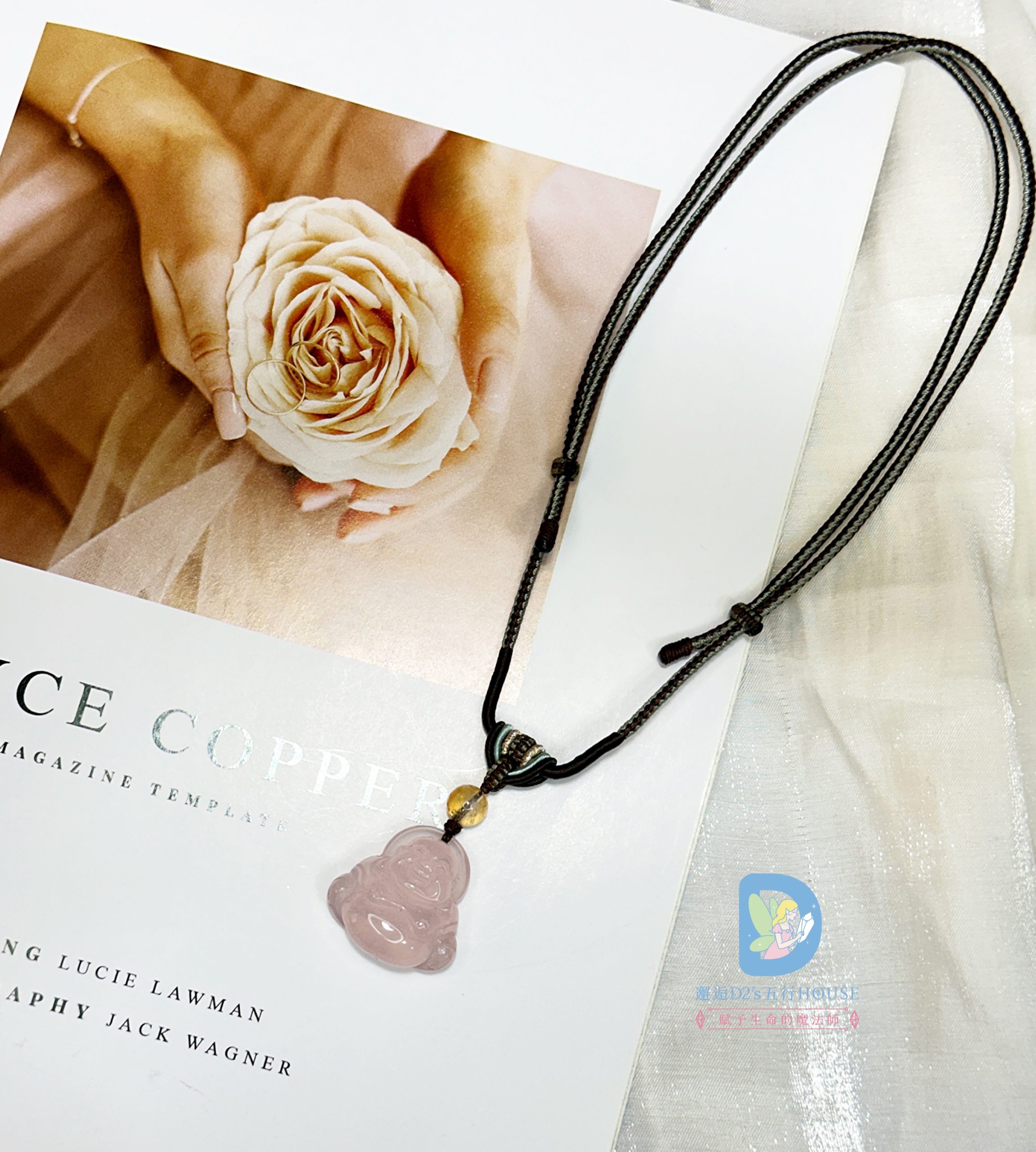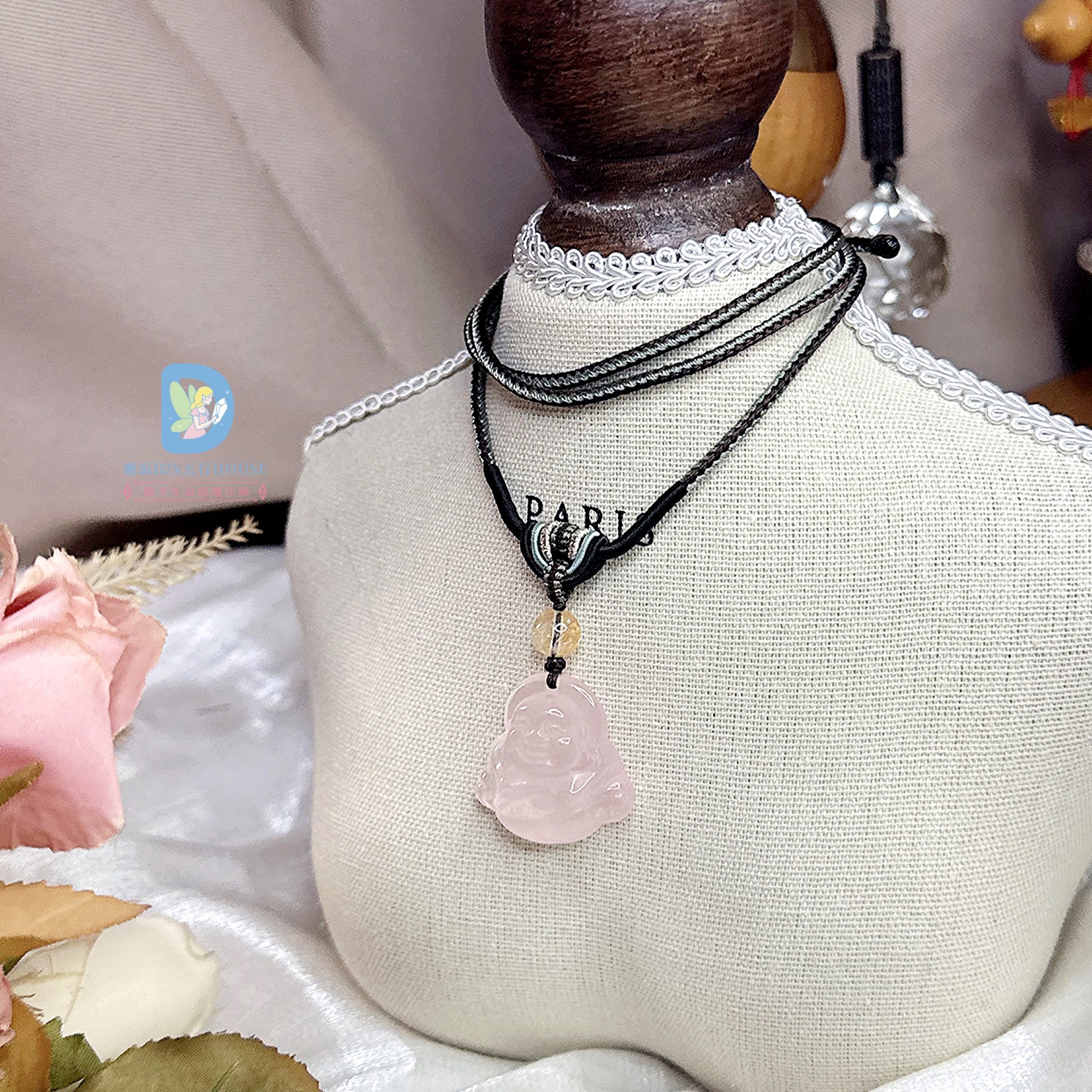 結合粉晶的柔和氣息與彌勒造型的開朗寓意,